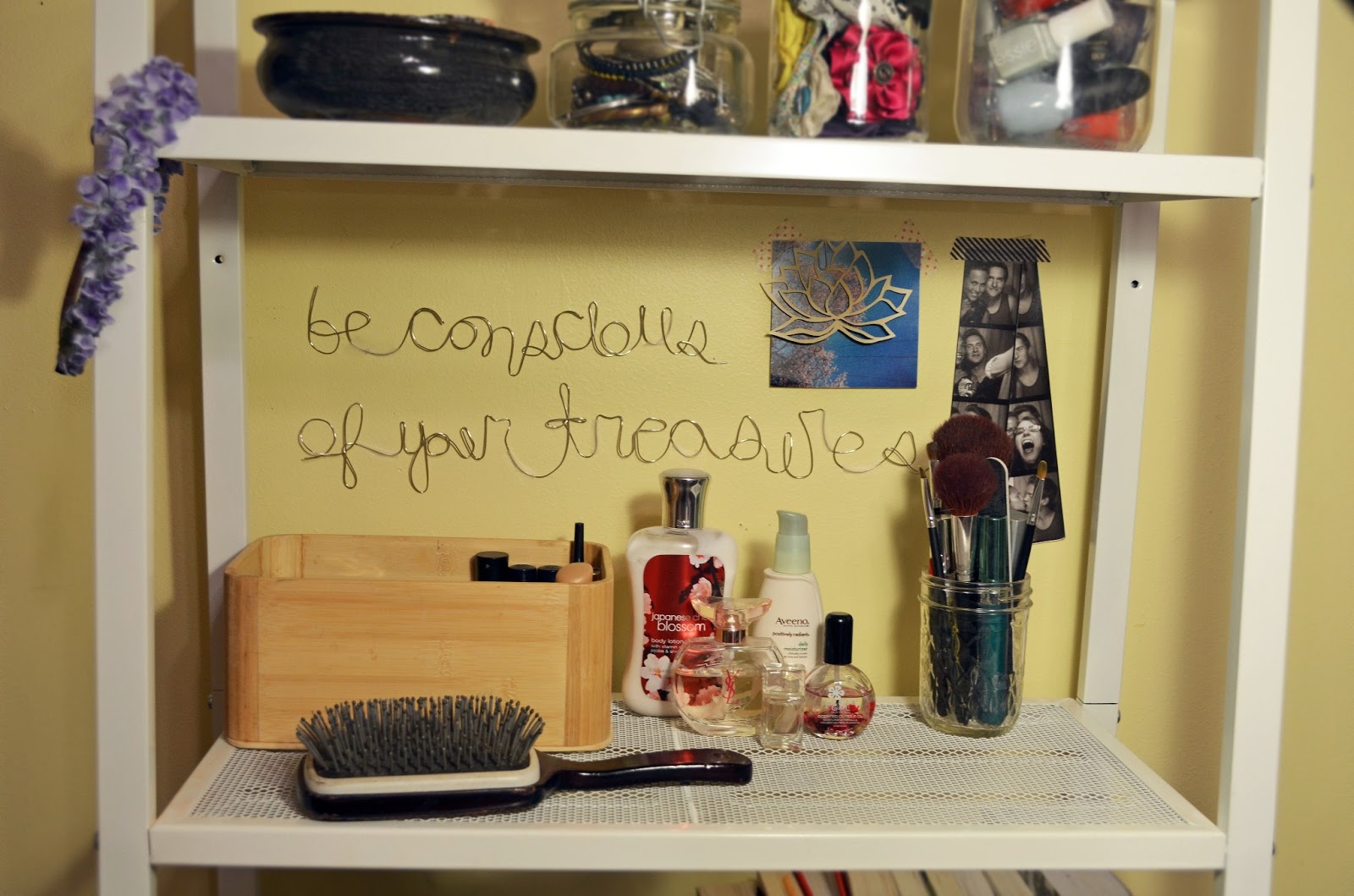 Just find a short phrase that you like and shape the wire into letters with your hands. My phrase was inspired by a quote from Thornton Wilder. “We can only be said to be alive in those moments when our hearts are conscious of our treasures.” It will be a nice reminder to have in a place where I look every morning while getting ready. I attached mine to the wall with some scotch tape (the matte kind, so the light doesn't make it show) and it's not noticeable at all. If I wasn't renting I would probably just hang it from a few of those sewing pins that don't have the balls on the ends (this kind).